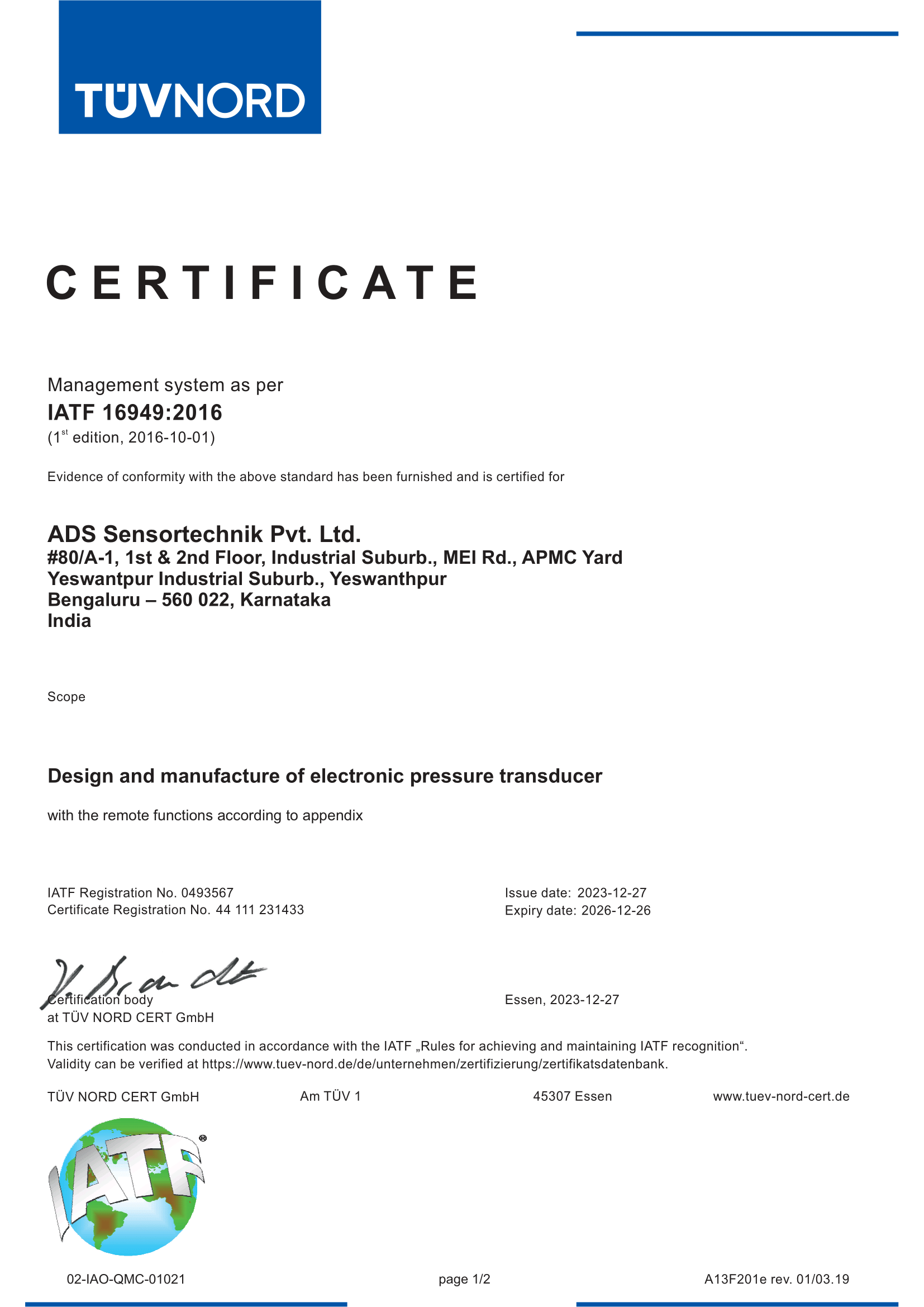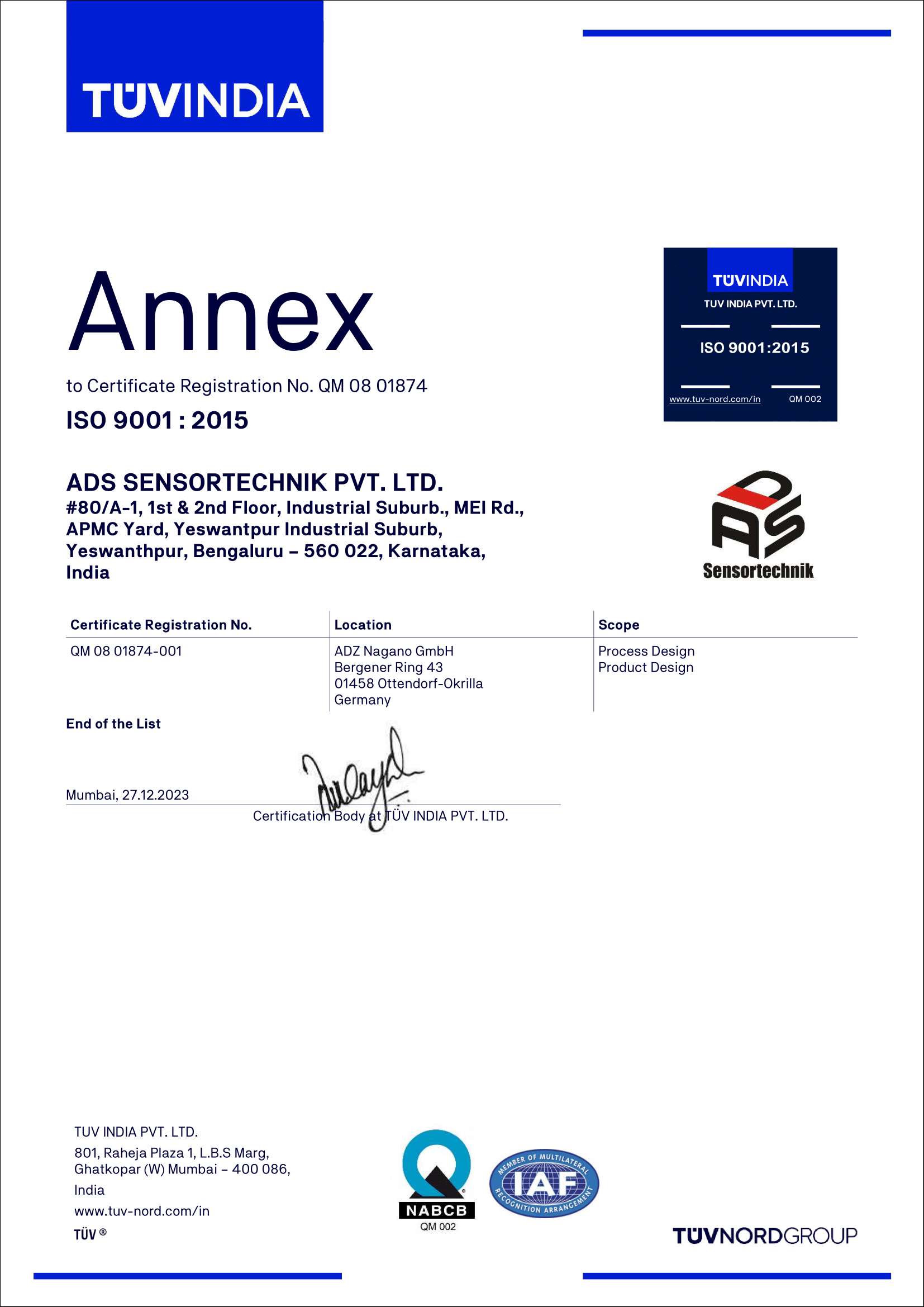 ADS Sensortechnik as partners to ADZ Nagano Germany will “Deliver to Customers Products matching the best in the industry by value addition through, Customer Oriented Process, Technology, & Continuous Improvement implemented at all appropriate levels of the Organization” as a Manufactured product.